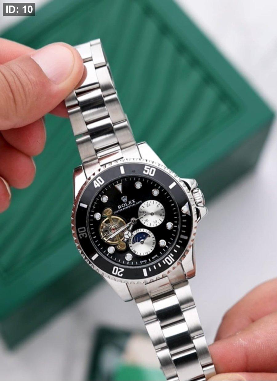 שעון רולקס אטומטי ללא צורך בסוללה, עם רצועת כסף ולוח שחור וכסף אלגנטי. משלוב בין יוקרה, דיוק ונוחות יומיומית, מושלם למי שמעריך סטייל קלאסי ומודרני בו זמנית.