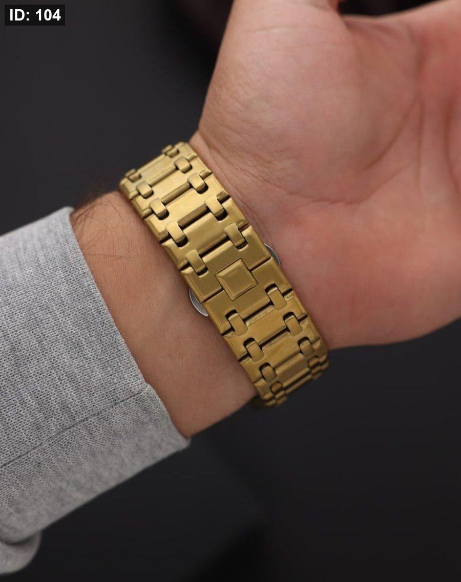 שעון אלגנטי עם רצועת בצבע זהב , גוף בצבע זהב , ולוח ירוק יוקרתי עם נגיעות זהב , עם תצוגה ברורה של תאריך .