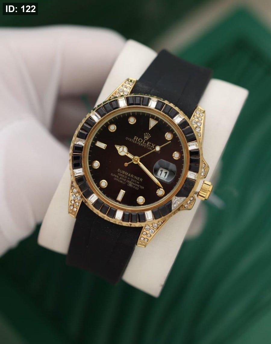 עון רולקס יוקרתי עם רצועת עור שחורה ולוח בצבע שחור, עיצוב אלגנטי ומרשים שמשלב קלאסיות עם נגיעה מודרנית. מתאים לכל מראה ולכל אירוע.