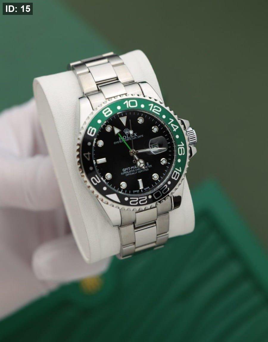 שעון רולקס יוקרתי עם רצועת כסף ולוח שחור, כולל גלגל מסתובב בשילוב ירוק ותצוגת תאריך. עיצוב מרהיב שמשלב יוקרה, סטייל ונוכחות מרשימה בכל הופעה.