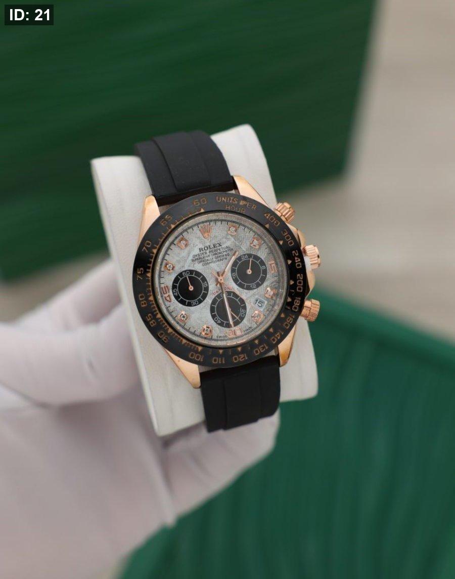 שעון רולקס יוקרתי עם רצועת עור שחורה, גוף בצבע זהב ולוח לבן גרניט אלגנטי. עיצוב קלאסי ומרשים שמשדר יוקרה, סטייל ודיוק מושלם לכל אירוע.