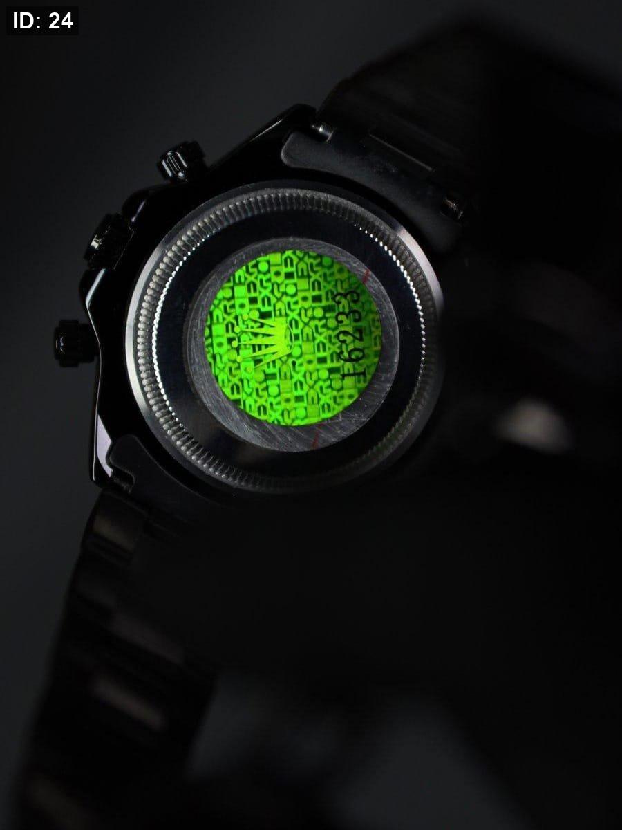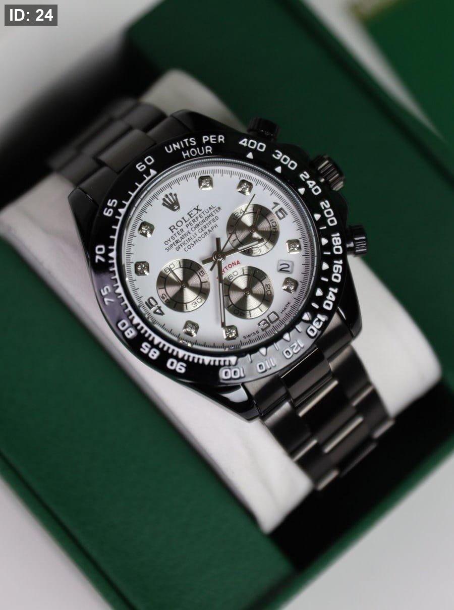שעון רולקס יוקרתי עם שלוש מכונות פעילות, רצועות שחורות וכיתוב לבן, ולוח לבן קלאסי. עיצוב אלגנטי וספורטיבי שמשלב יוקרה, פונקציונליות וסטייל מודרני בכל הופעה.