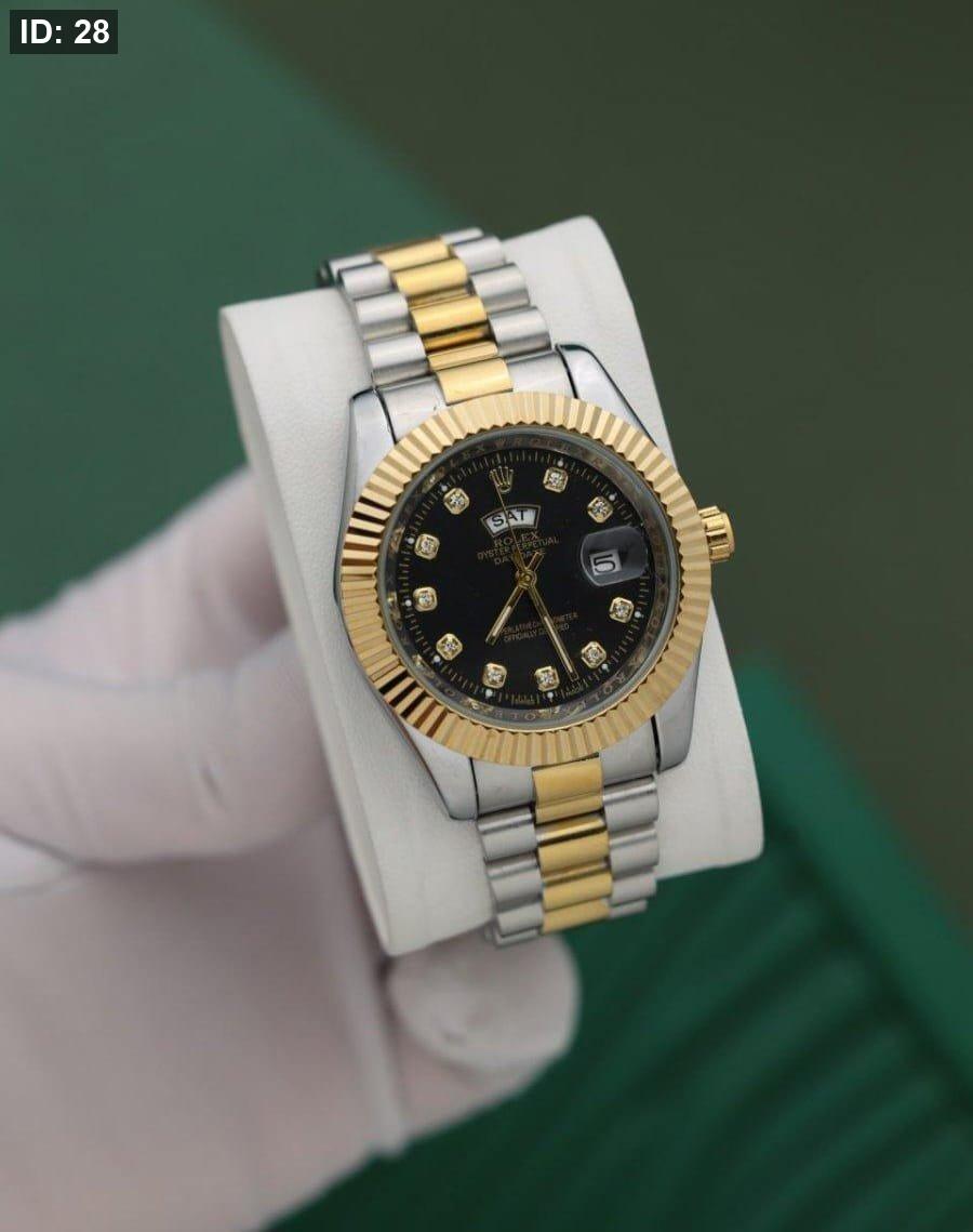 שעון רולקס יוקרתי עם רצועת כסף וזהב ולוח שחור, כולל תצוגת תאריך ויום. עיצוב קלאסי ומרשים שמשדר יוקרה, סטייל ודיוק מושלם לכל אירוע.