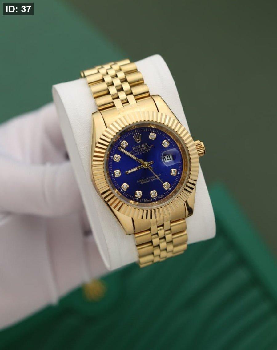 שעון רולקס יוקרתי בצבע זהב מלא עם לוח כחול כהה אלגנטי ותצוגת תאריך. עיצוב מרשים שמשלב יוקרה, סגנון ואלגנטיות קלאסית לכל הופעה.