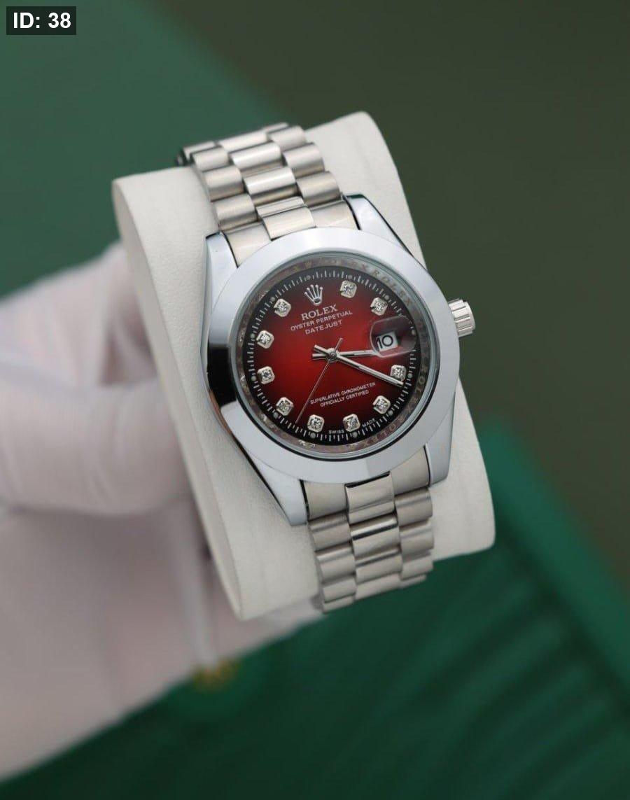 שעון רולקס יוקרתי בצבע כסף מלא עם רצועת כסף, לוח אדום עם מסגרת צדדים שחורה ותצוגת תאריך. עיצוב נועז ואלגנטי שמשדר יוקרה, סגנון ונוכחות מרשימה.
