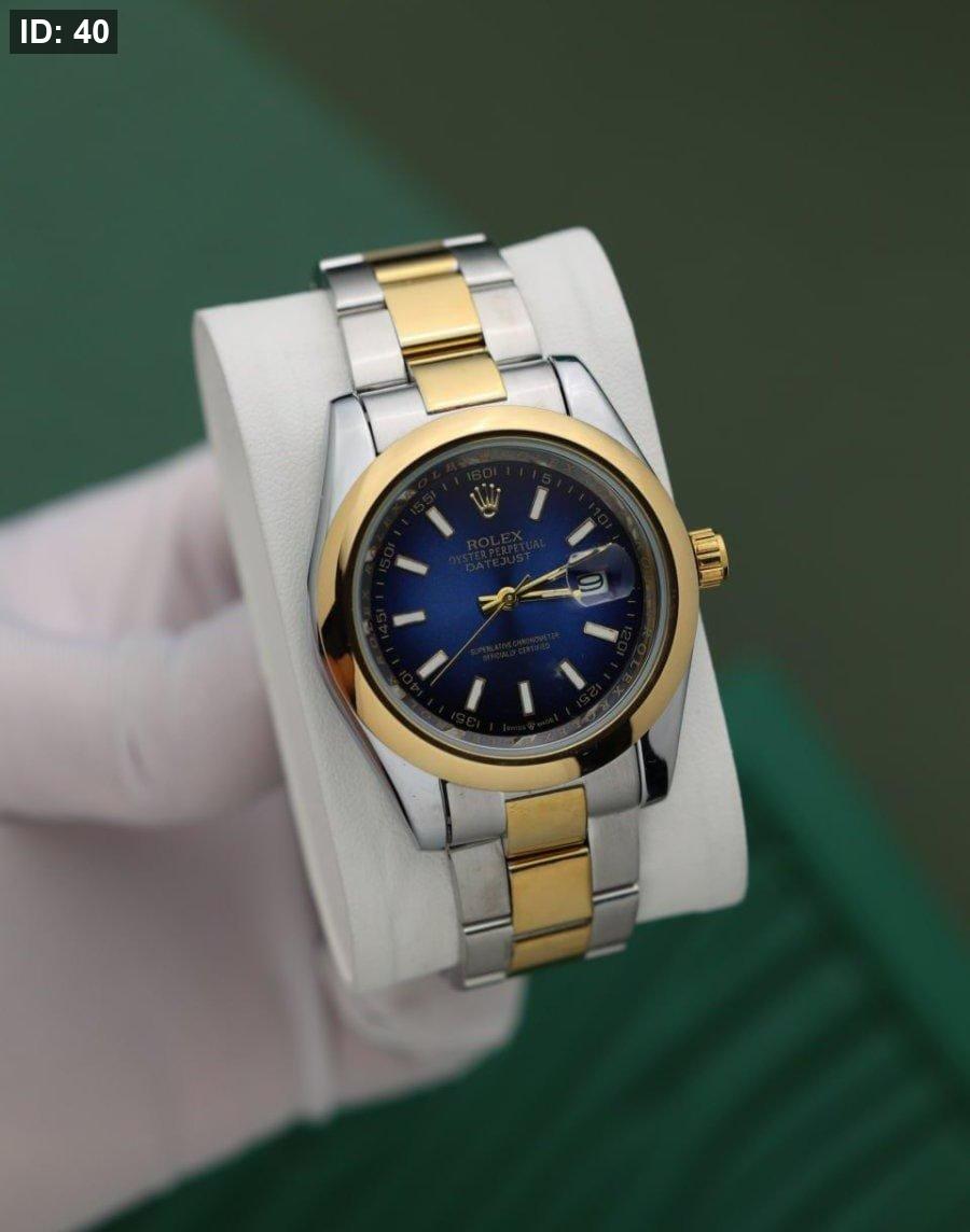 שעון רולקס יוקרתי בשילוב צבעים כסף וזהב, עם לוח כחול אלגנטי ומסגרת צדדים שחורה, כולל תצוגת תאריך. עיצוב מרהיב שמשלב יוקרה, סטייל ונוכחות ייחודית בכל הופעה.