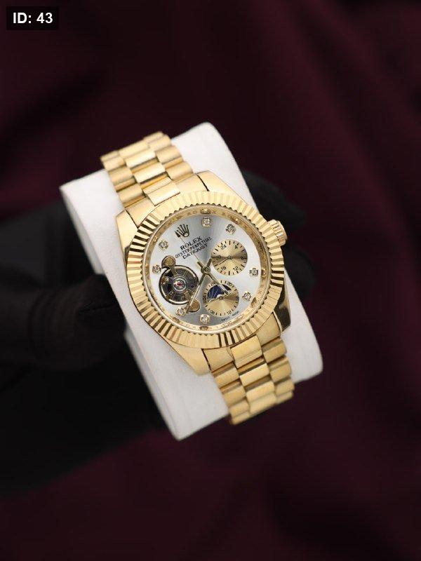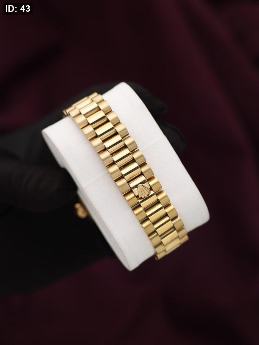 שעון רולקס אטומטי ללא סוללה בצבע זהב מלא, כולל רצועה זהובה ולוח משולב זהב-לבן. עיצוב יוקרתי וקלאסי שמשדר סטייל, דיוק ונוכחות מרשימה בכל הופעה.