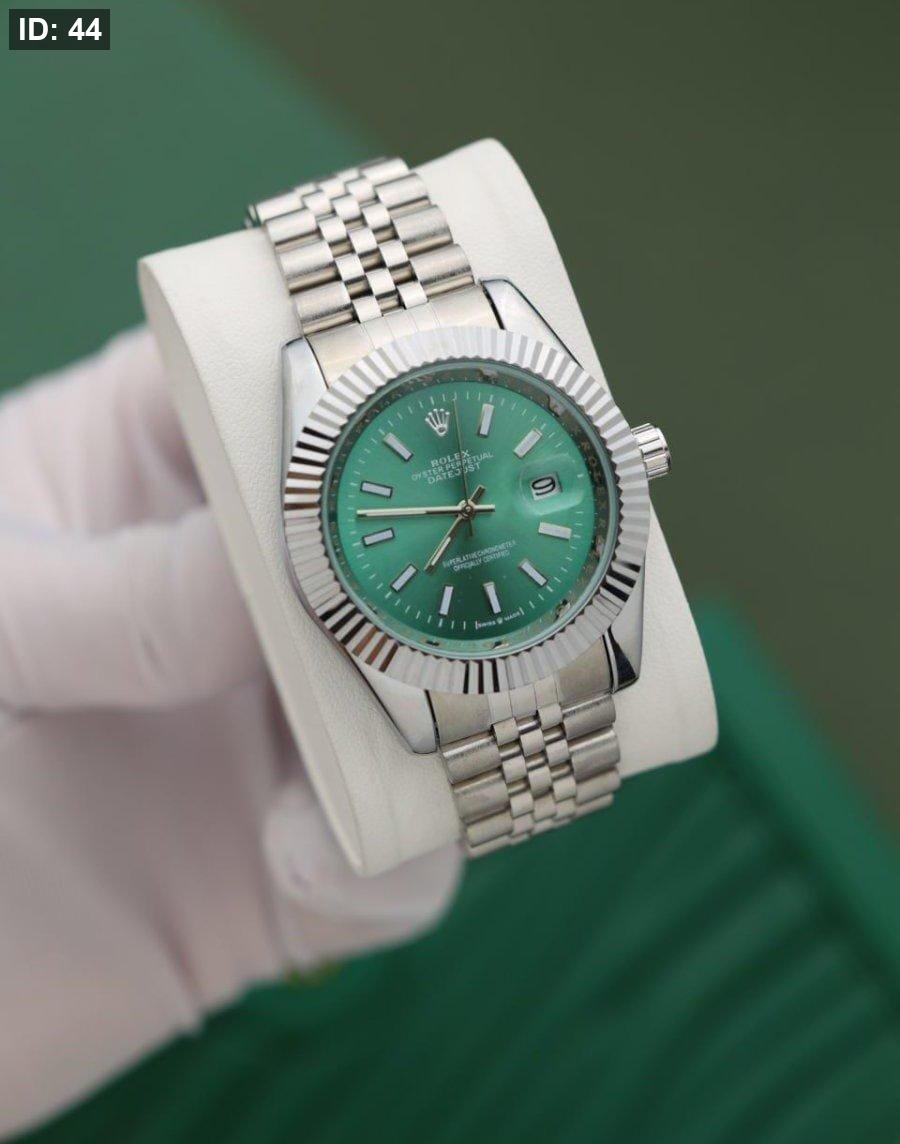שעון רולקס יוקרתי עם רצועת כסף ולוח ירוק בהיר, כולל תצוגת תאריך . עיצוב קלאסי ומרשים שמשדר יוקרה, סטייל ודיוק מושלם לכל אירוע.
