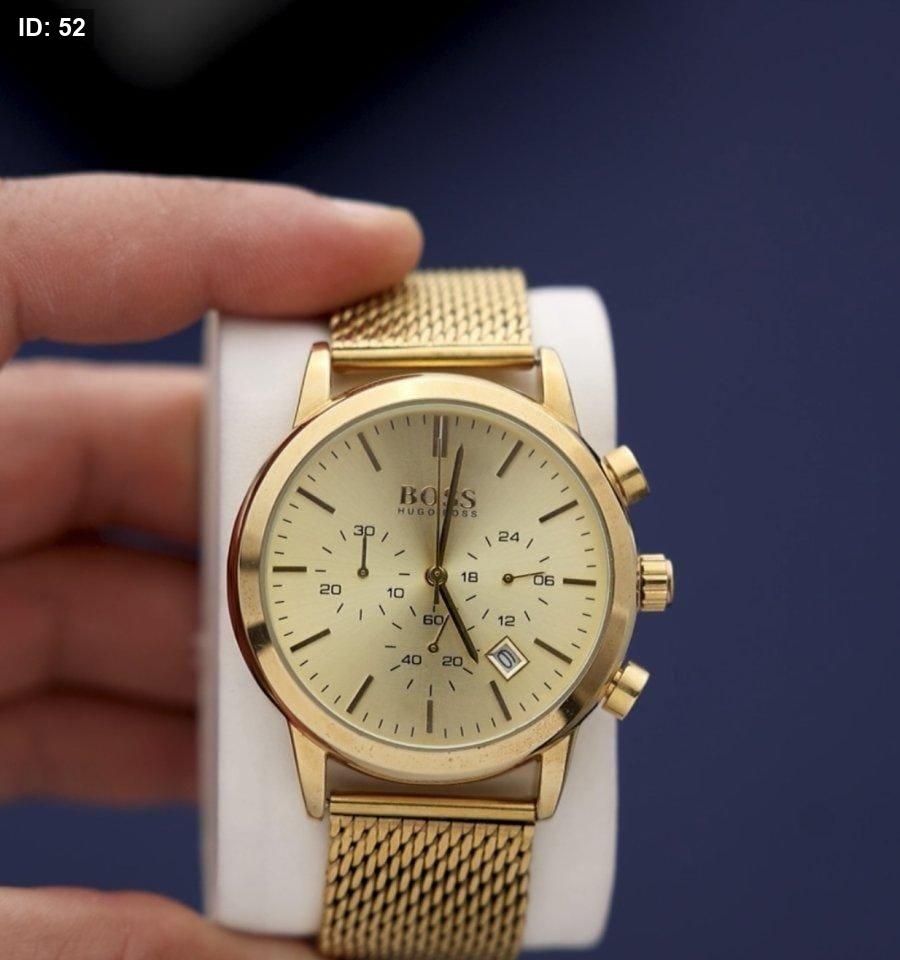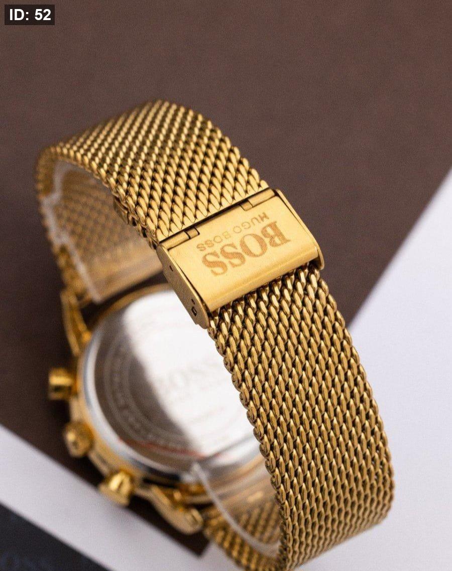 שעון BOSS יוקרתי בצבע זהב מלא, כולל לוח זהב כהה ותצוגת תאריך . עיצוב אלגנטי ונוצץ שמשדר יוקרה, סגנון ונוכחות בלתי מתפשרת.