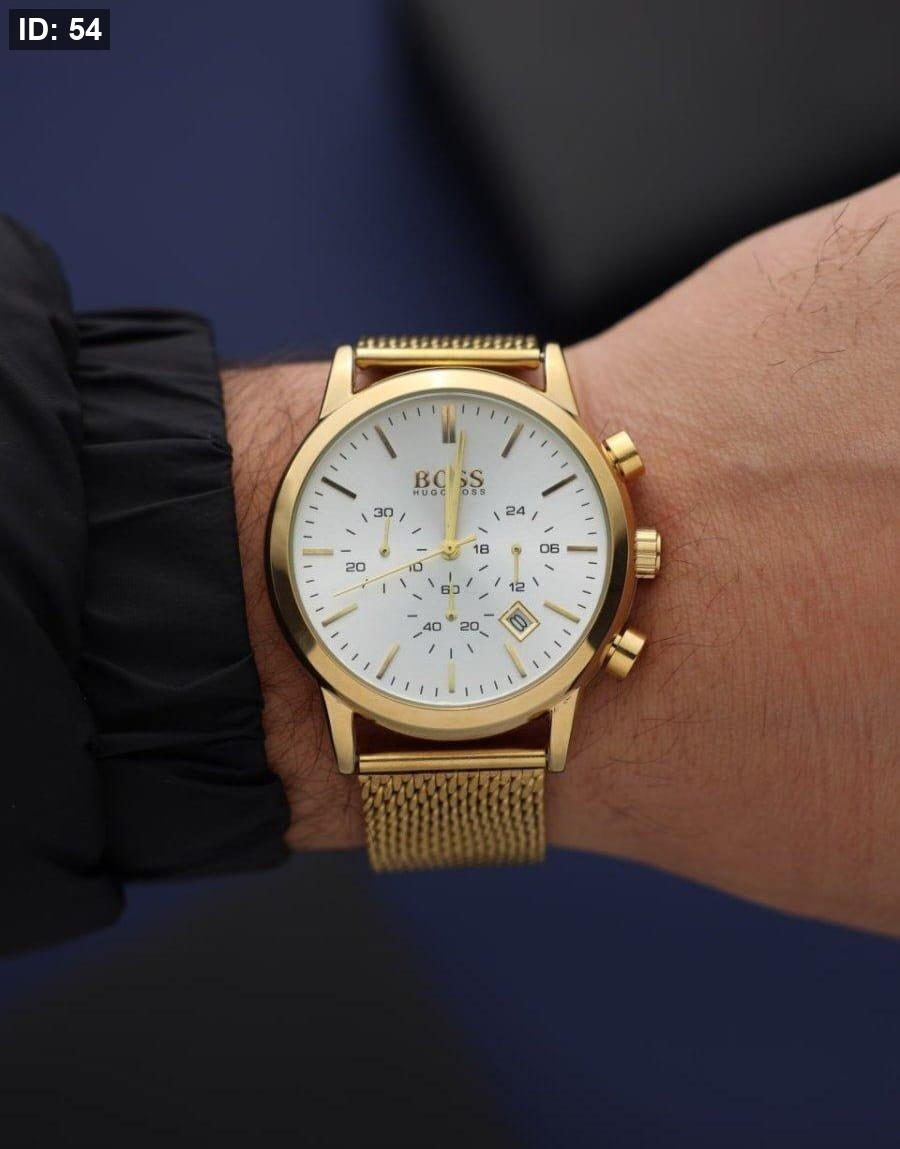 שעון BOSS יוקרתי בצבע זהב מלא, כולל לוח בצבע לבן ותצוגת תאריך . עיצוב אלגנטי ונוצץ שמשדר יוקרה, סגנון ונוכחות בלתי מתפשרת.