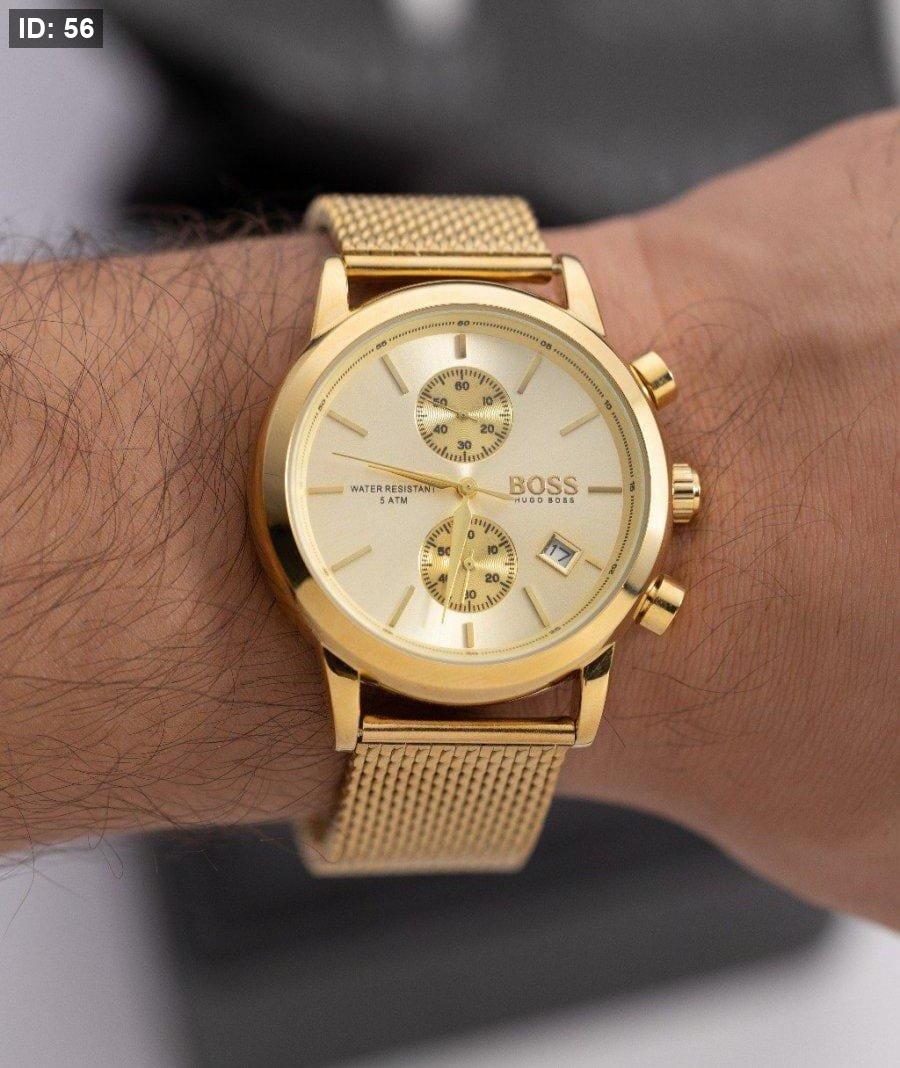 שעון BOSS יוקרתי בצבע זהב מלא, כולל לוח בצבע זהב ותצוגת תאריך . עיצוב אלגנטי ונוצץ שמשדר יוקרה, סגנון ונוכחות בלתי מתפשרת.