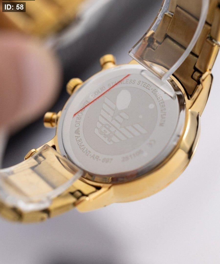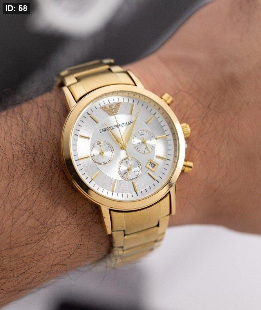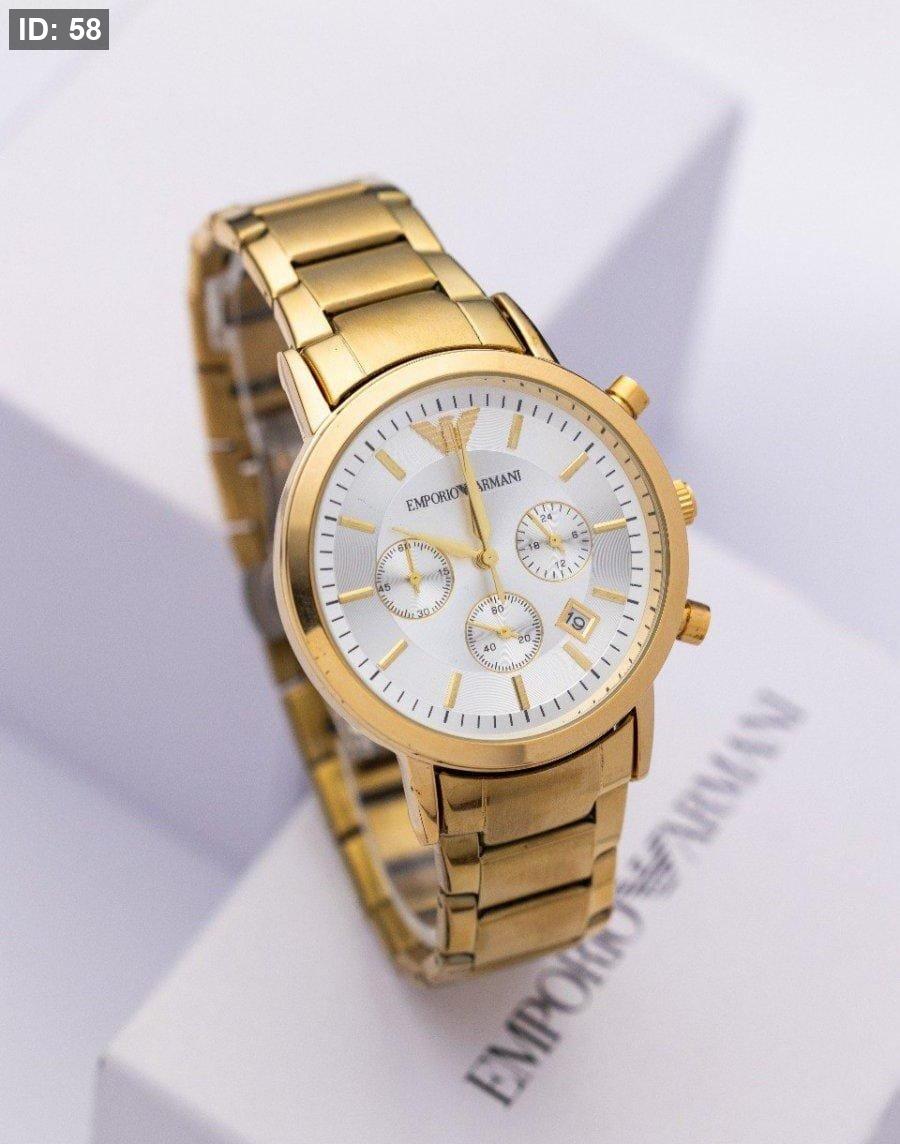 שעון ארמאני יוקרתי בצבע זהב מלא עם לוח לבן קלאסי ותצוגת תאריך. עיצוב אלגנטי ונקי שמשדר יוקרה, סגנון ודיוק איטלקי מושלם.