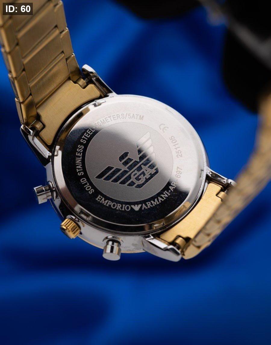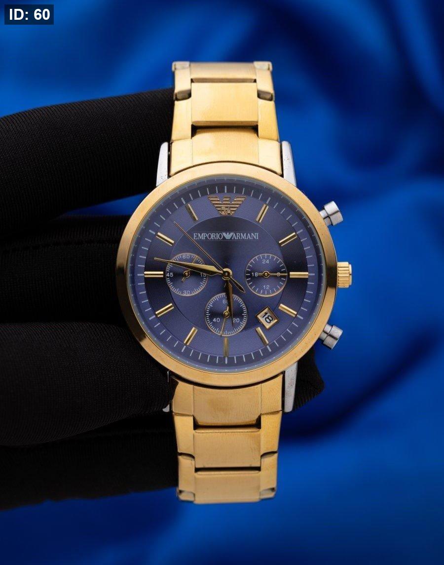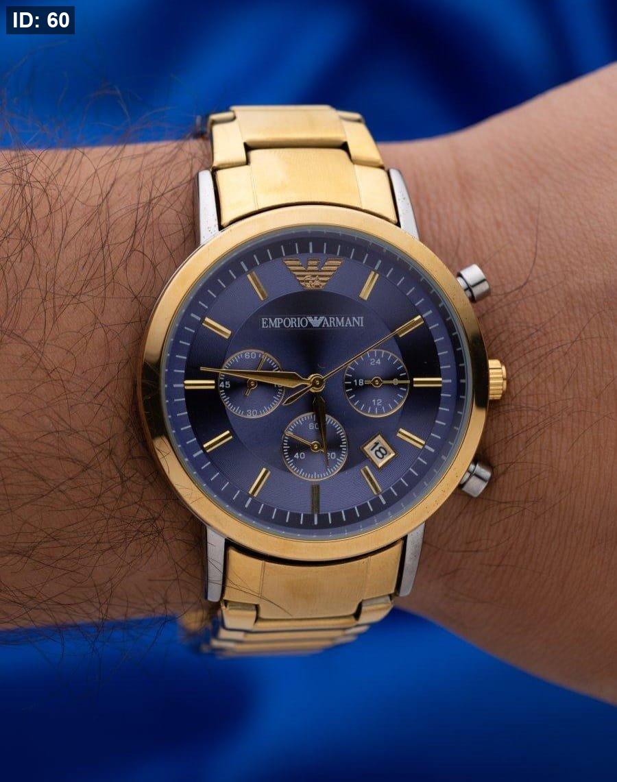 שעון ארמאני יוקרתי בשילוב צבעים זהב וכסף, עם לוח כחול כהה אלגנטי ותצוגת תאריך. עיצוב יוקרתי ומודרני שמשדר סטייל, אלגנטיות ודיוק מושלם בכל רגע.