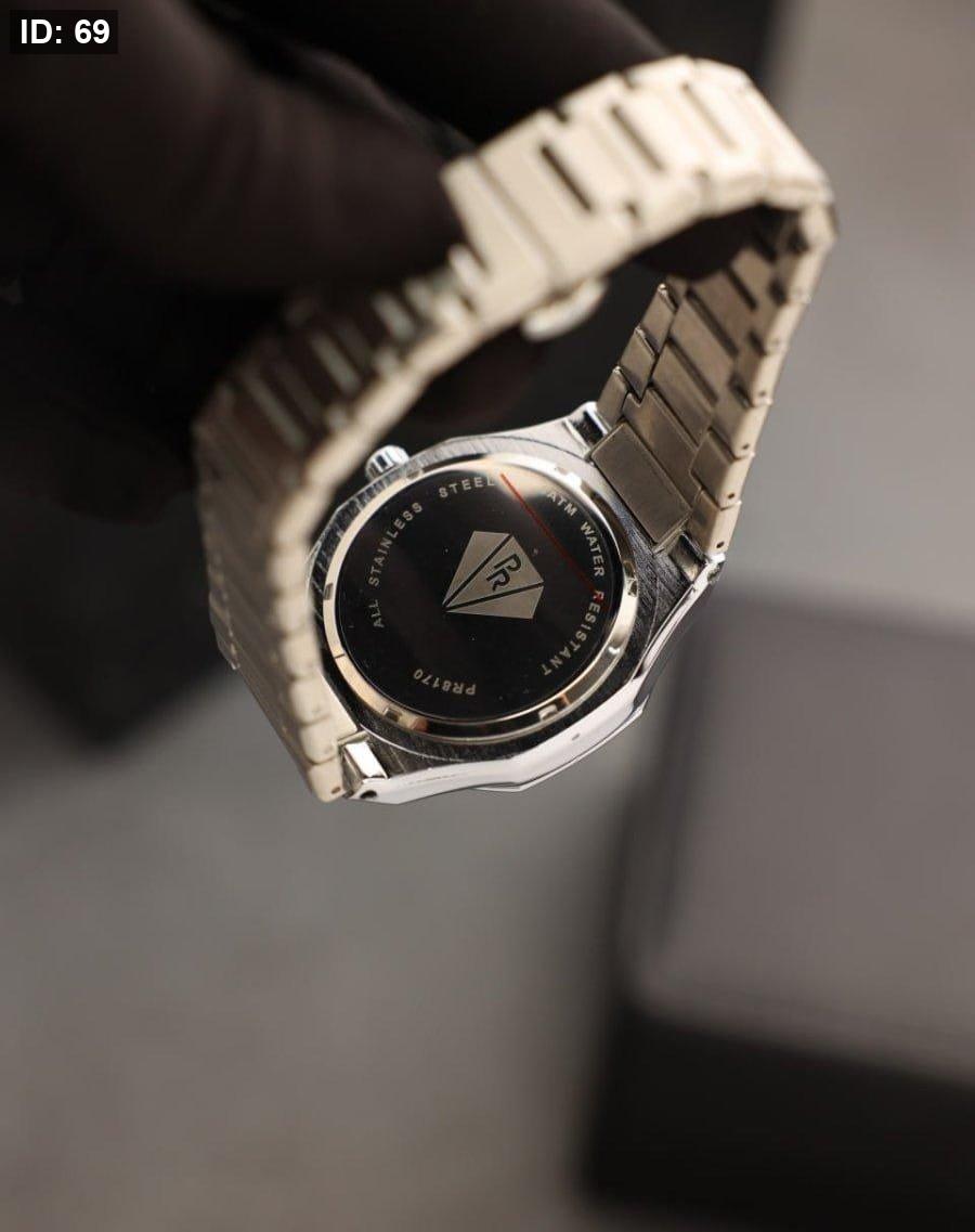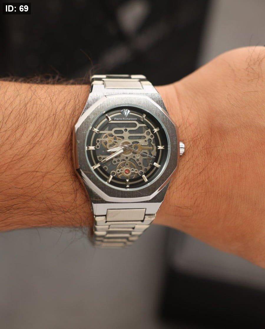 שעון Pierre Richardson יוקרתי בצבע כסף מלא, עם לוח משולב בגווני כסף כהה ובהיר. עיצוב אלגנטי וקלאסי שמשדר סטייל, יוקרה ונוכחות מרשימה בכל הופעה.