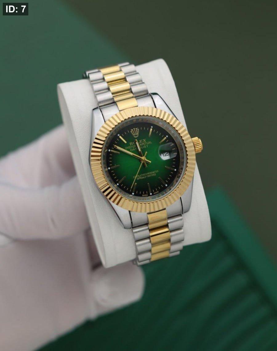 שעון רולקס יוקרתי בצבעים משולבים של כסף וזהב עם לוח ירוק מרהיב, עיצוב קלאסי שמשדר יוקרה ונוכחות. מתאים לאנשים שאוהבים סטייל בולט ואלגנטיות אמיתית.