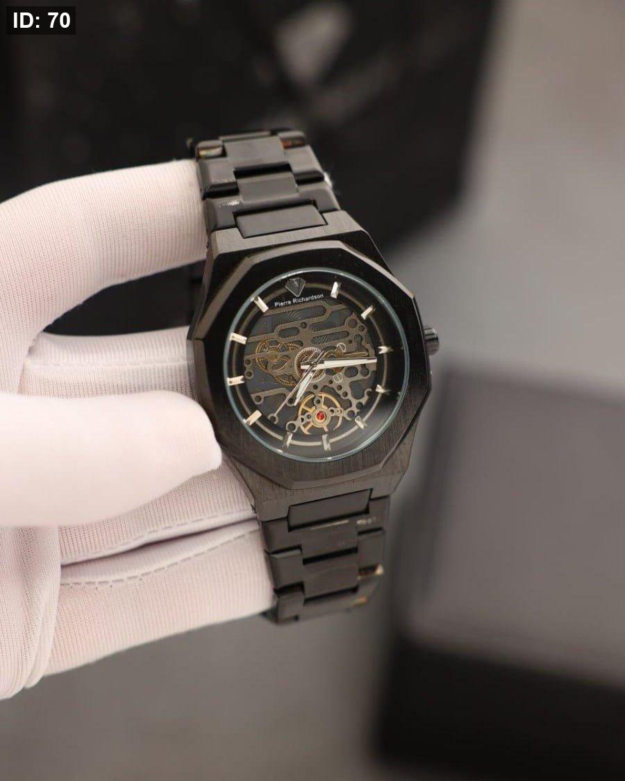 שעון Pierre Richardson יוקרתי בצבע שחור מלא, עם לוח משולב בגווני שחור כהה ובהיר. עיצוב אלגנטי וקלאסי שמשדר סטייל, יוקרה ונוכחות מרשימה בכל הופעה.