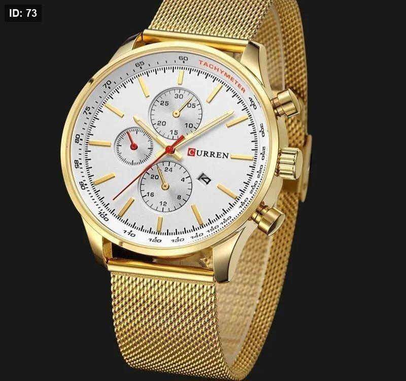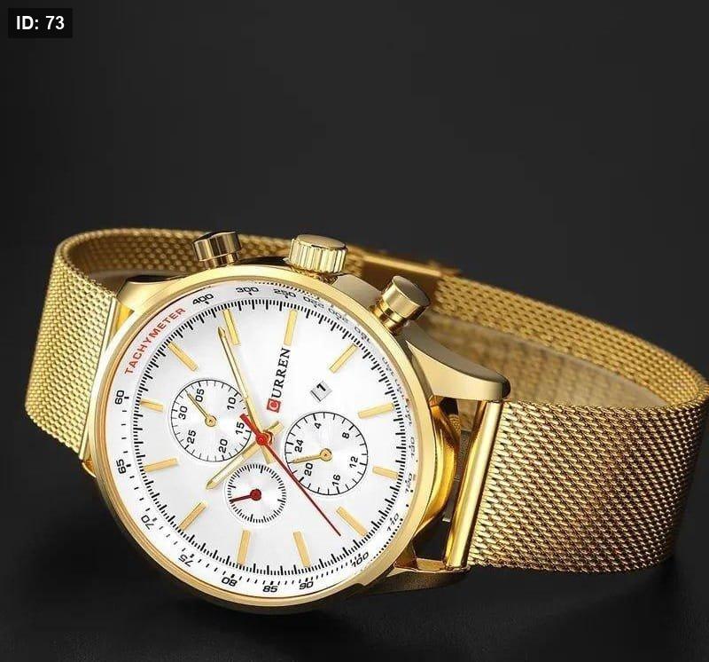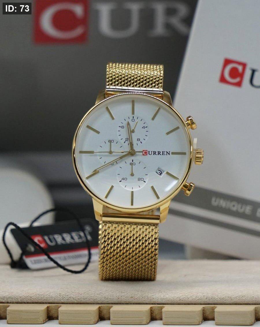 שעון CURREN יוקרתי בצבע זהב מלא, כולל לוח בצבע לבן ותצוגת תאריך . עיצוב אלגנטי ונוצץ שמשדר יוקרה, סגנון ונוכחות בלתי מתפשרת.