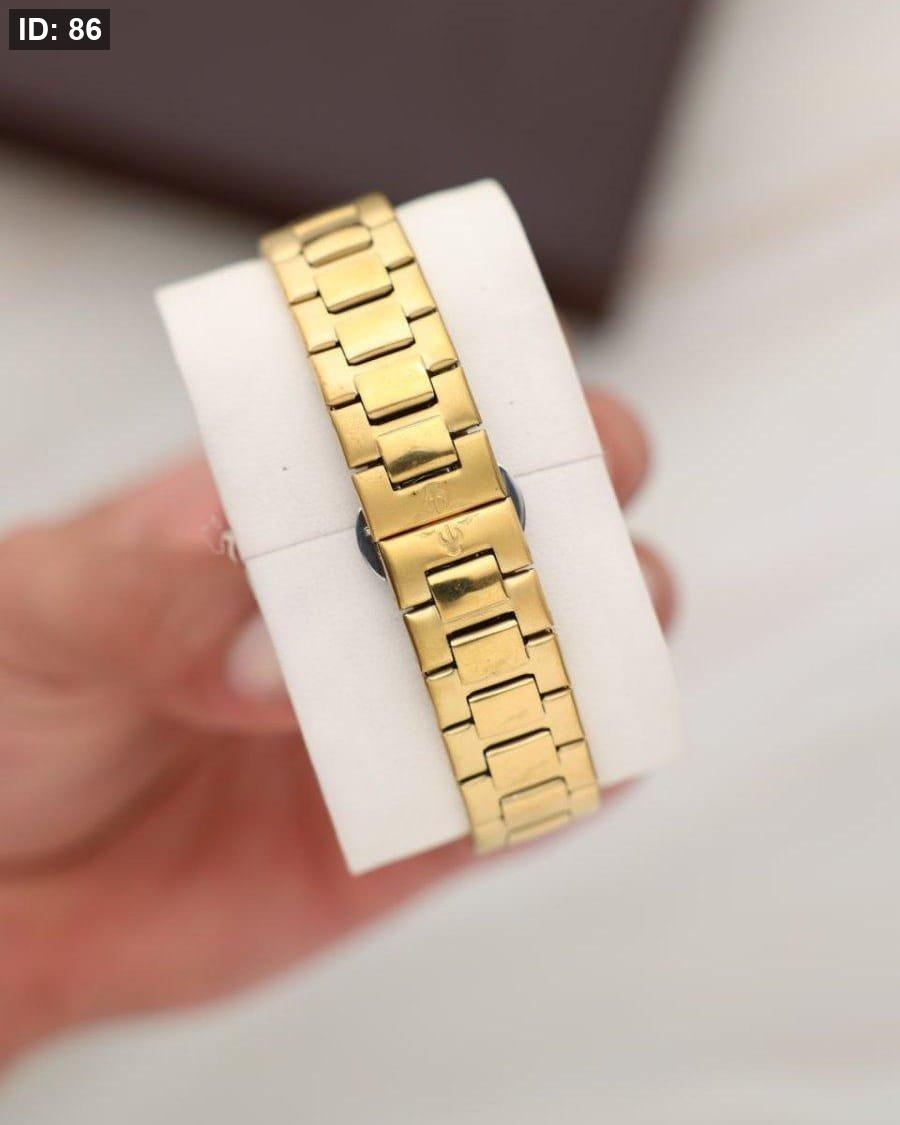כל השעון בצבע זהב יוקרתי, עם לוח לבן אלגנטי שבו ניתן לראות את המנגנון הפנימי בפעולה.