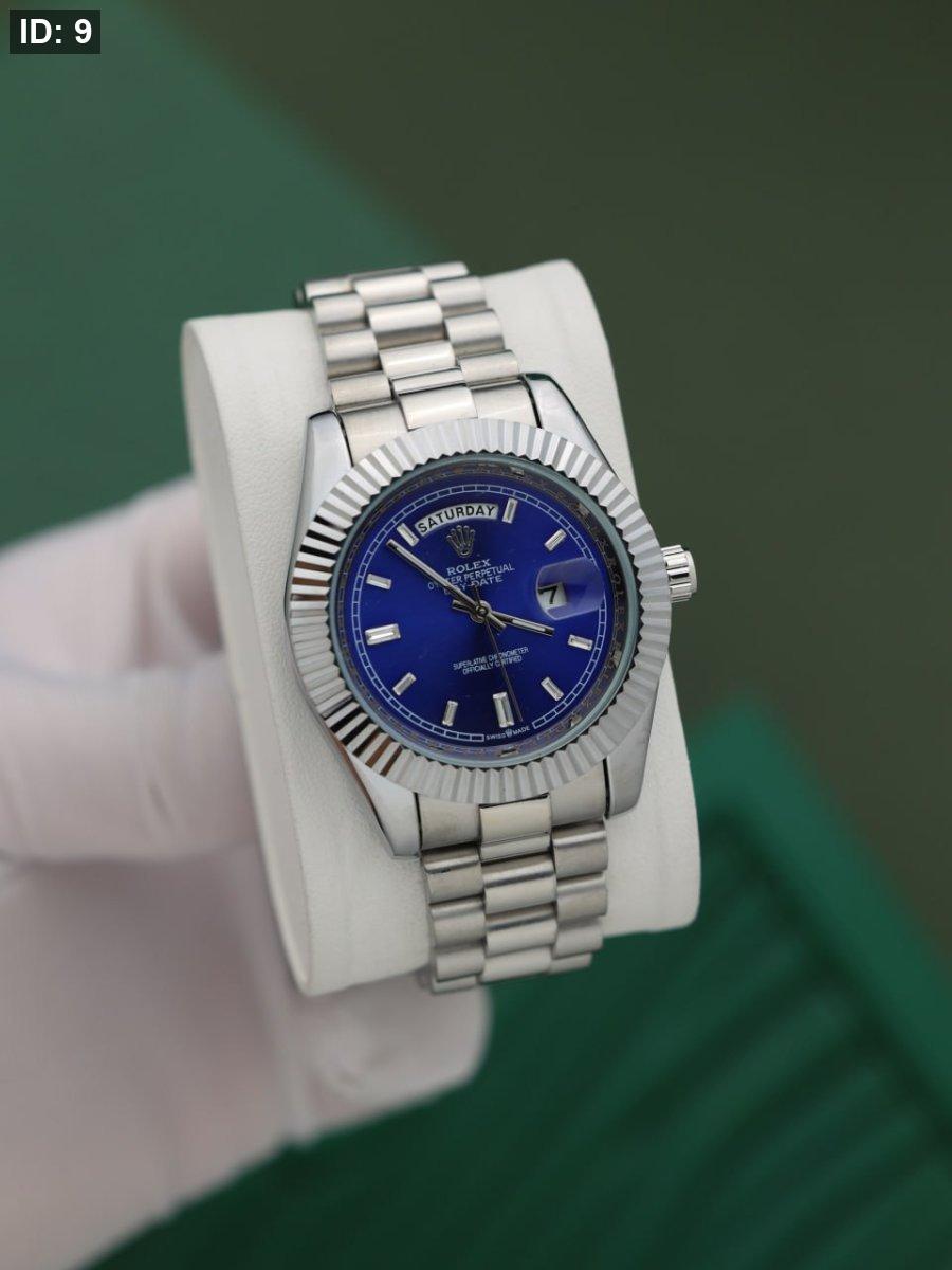 שעון רולקס יוקרתי עם רצועת כסף ולוח כחול אלגנטי, כולל תצוגת תאריך ויום. עיצוב קלאסי שמשלב יוקרה, נוחות ודיוק מושלם – מתאים לכל סגנון ולכל אירוע.