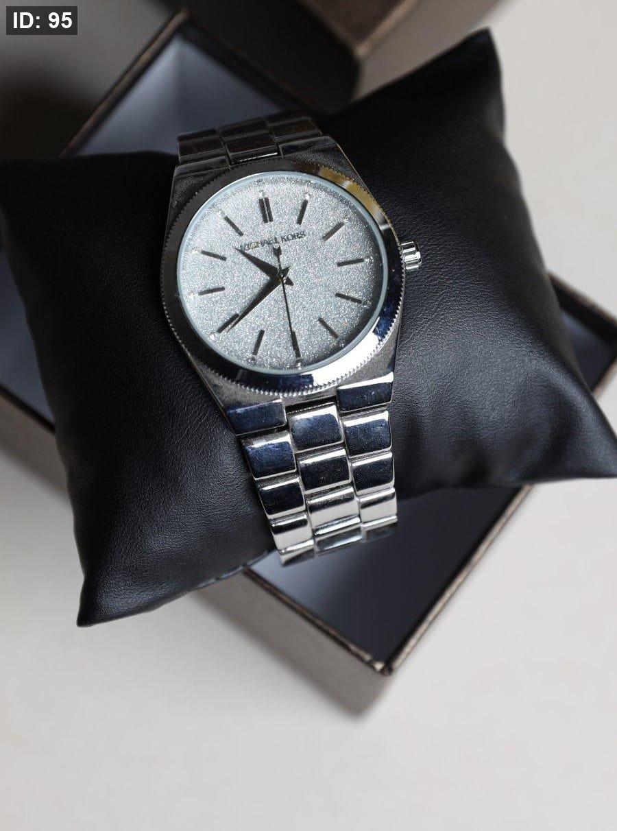 שעון אלגנטי עם רצועת בצבע כסף , גוף בצבע כסף , ולוח כסף נצנצ יוקרתי עם נגיעות כסף.