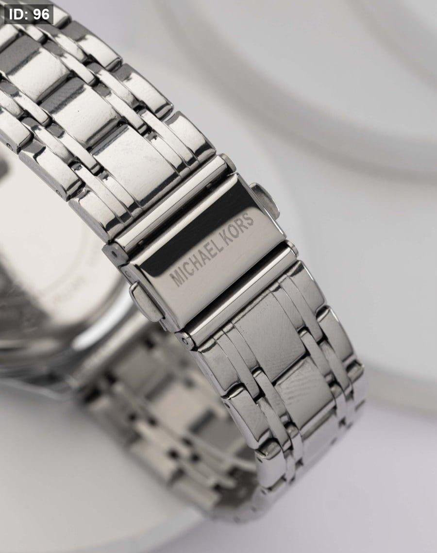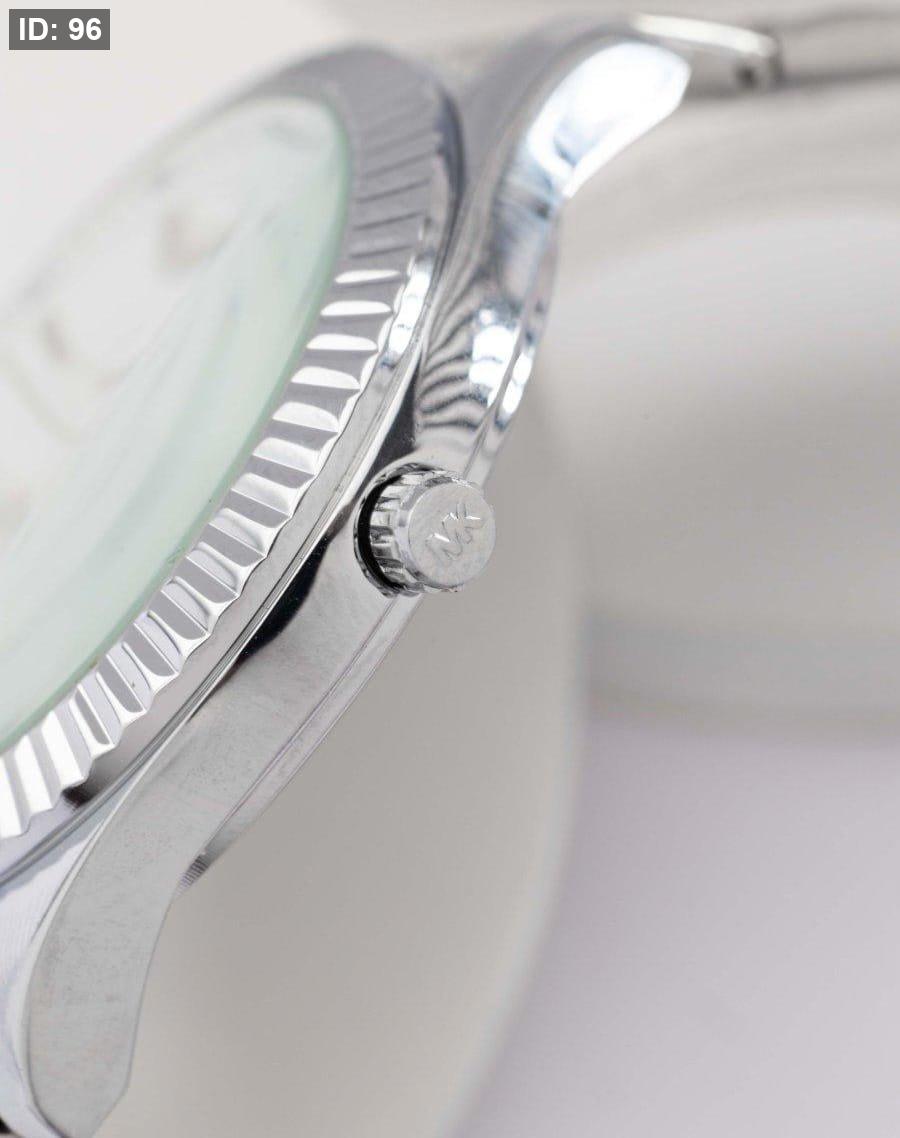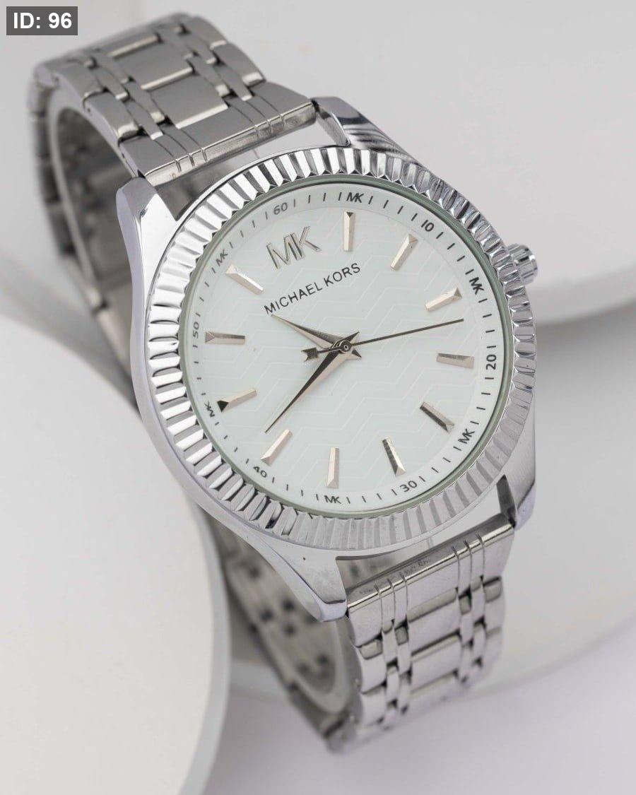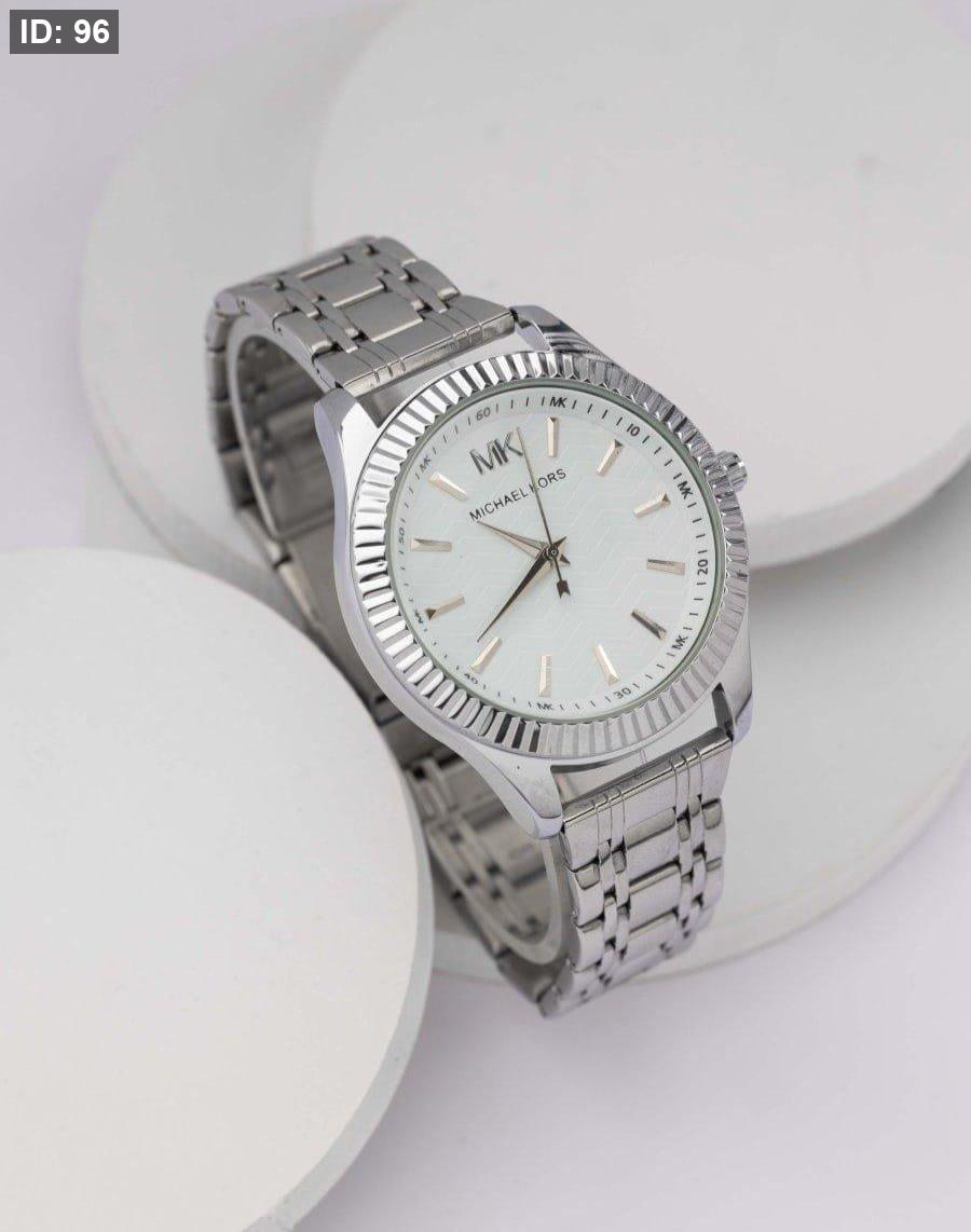שעון אלגנטי עם רצועת בצבע כסף , גוף בצבע כסף , ולוח לבןב יוקרתי עם נגיעות כסף.